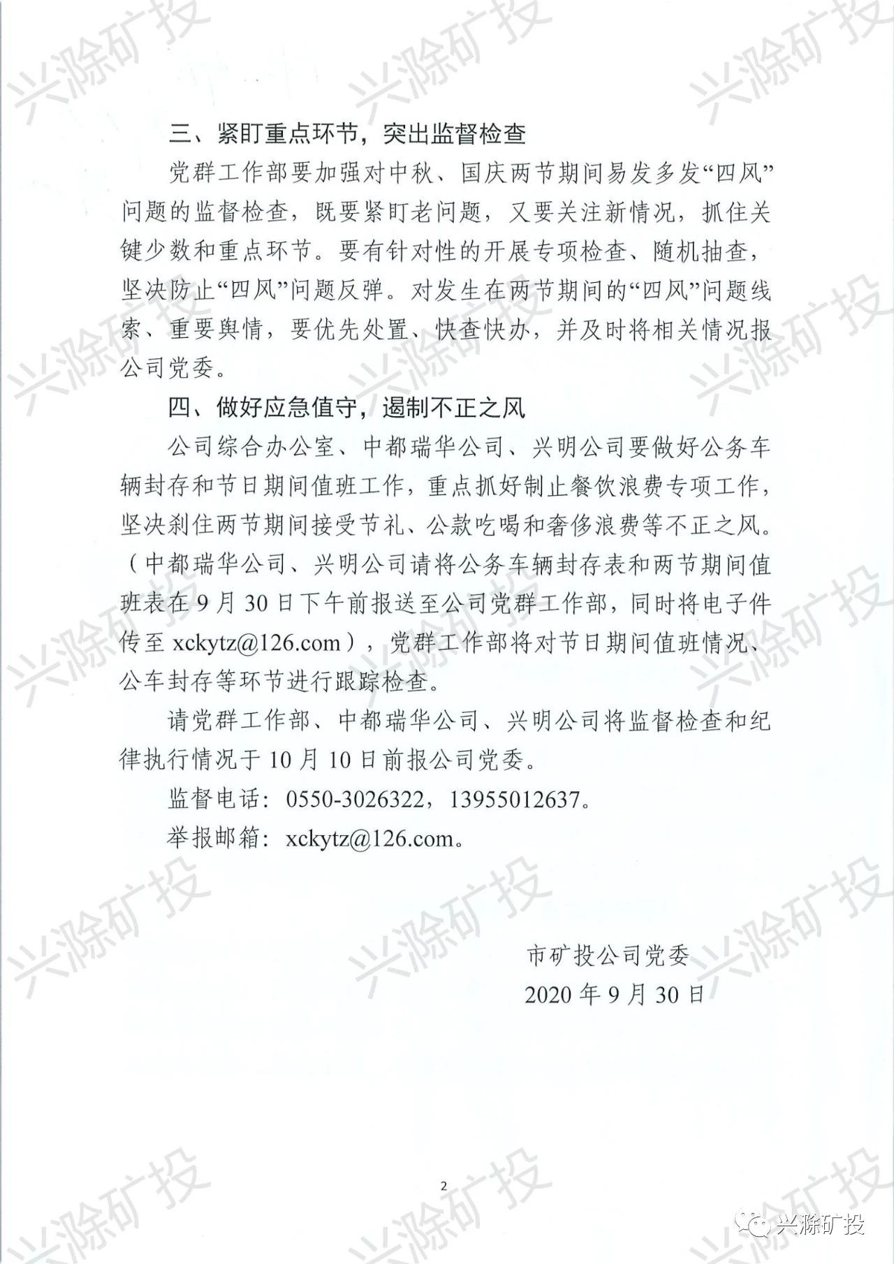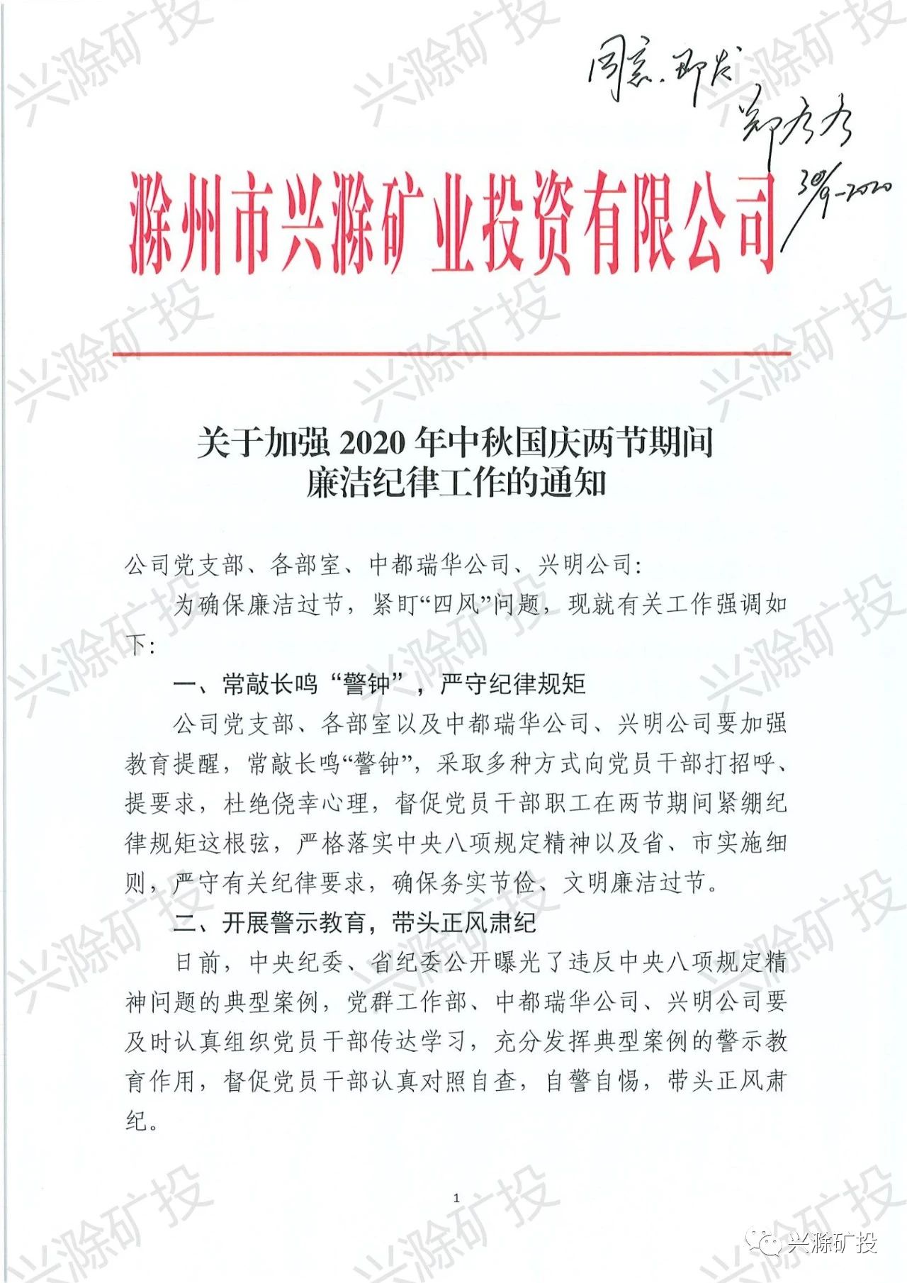 市礦投公司關于加強2020年中秋國慶兩節(jié)期間廉潔紀律工作的通知