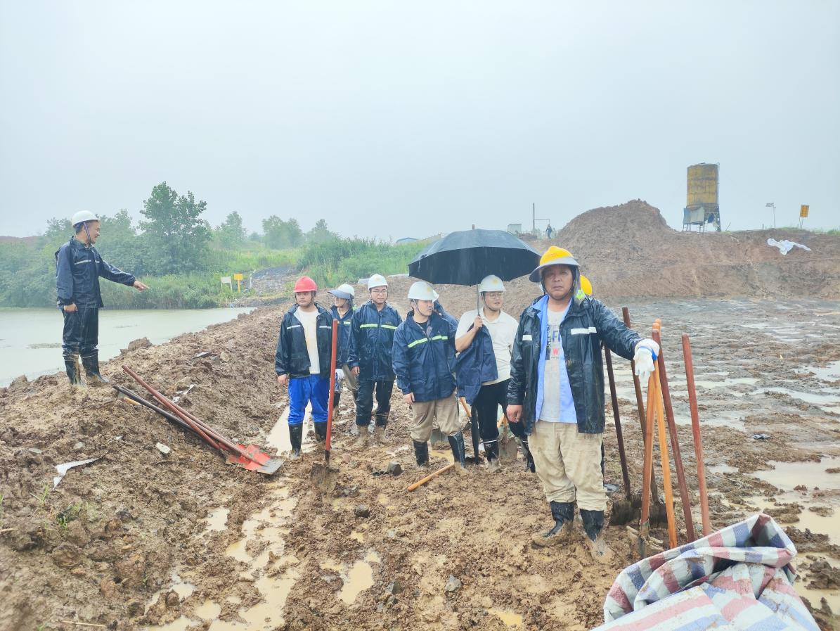 連日強(qiáng)降雨導(dǎo)致諭興礦界外河流水位暴漲,隨時(shí)可能漫進(jìn)礦坑,并淹沒兩側(cè)農(nóng)田。興天礦業(yè)立即啟動應(yīng)急預(yù)案,動員公司全體黨員干部職工、工程公司及實(shí)業(yè)公司項(xiàng)目部工作人員、運(yùn)輸隊(duì)司機(jī)等約30余名人員組成搶險(xiǎn)突擊隊(duì),調(diào)集挖機(jī)、渣土車用土石方對上游決口位置進(jìn)行封堵。與此同時(shí),突擊隊(duì)員肩扛沙袋、雨布等物資奔赴現(xiàn)場,爭分奪秒展開搶險(xiǎn)工作。